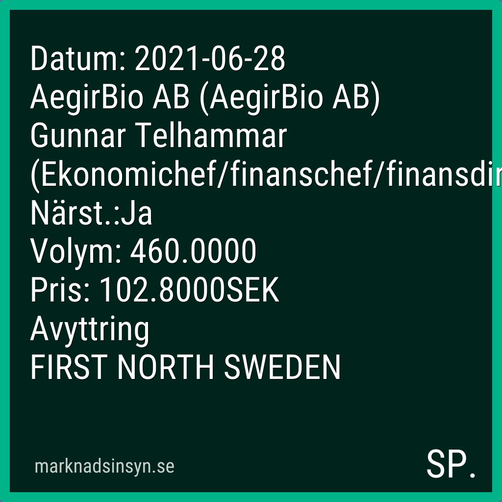 AegirBio is a Swedish diagnostic company that offers tests to monitor and optimize the dosage of biological drugs via its patented technology platform. Latest Aegirbio AB Share Price - Live AEGIR TO1 share price quotes charts profile RNS company financials for STOAEGIR TO1. It also outperformed the Biotechs.
